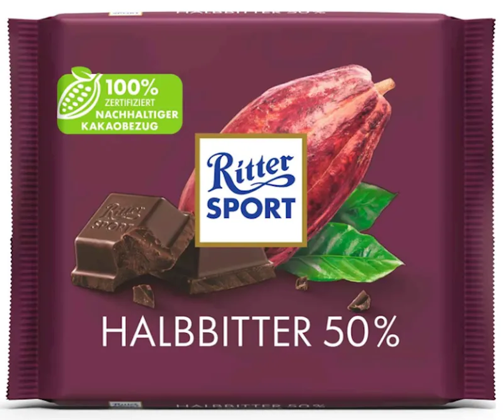 "RITTER SPORT" HALBBITTER 50% COCOA 100GR $2.85/12PC