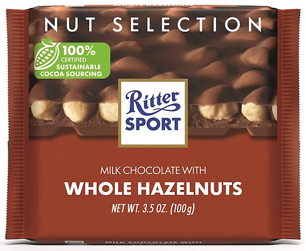 "RITTER SPORT" MILK CHOC. W/WHOLE HAZELNUT 100GR $2.85/10PC