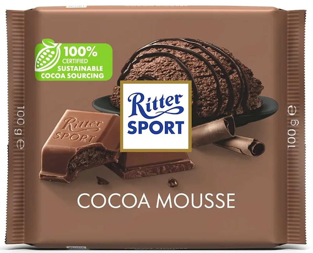 "RITTER SPORT" MILK CHOC. W/COCOA MOUSSE 100GR $2.85/11PC