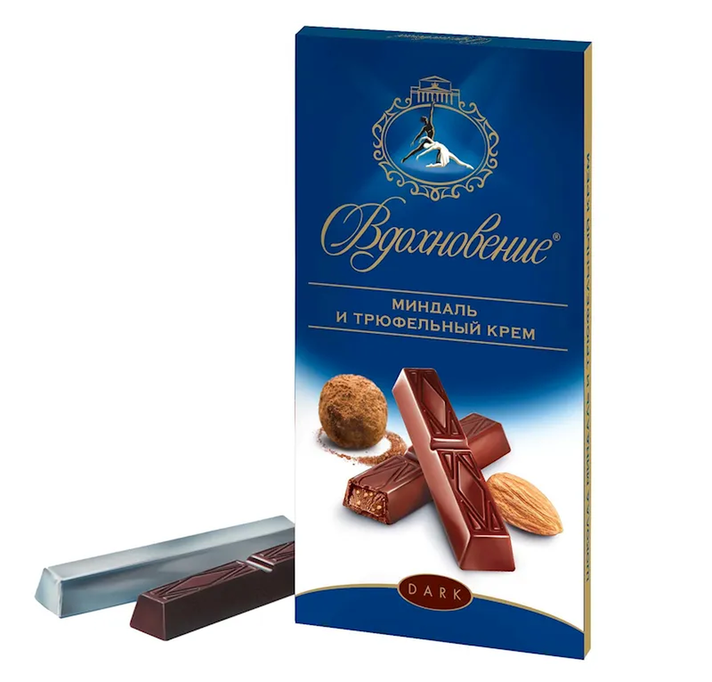 "VDOHNOVENIE" W/ALMOND AND TRUFFLE CREAM FILLING CHOCOLATE 90GR $2.35/17PC (68PC)