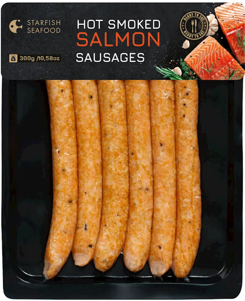 008 "STARFISH" HOT SMOKED SALMON SAUSAGE 300GR $10.50/4PC N/D